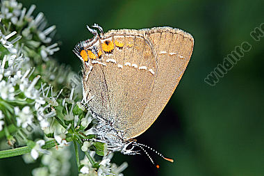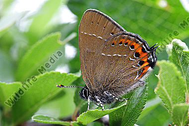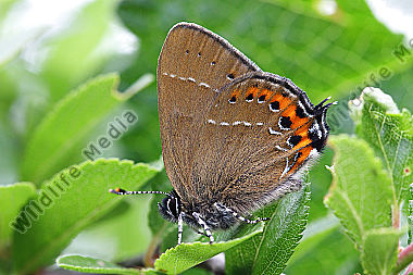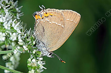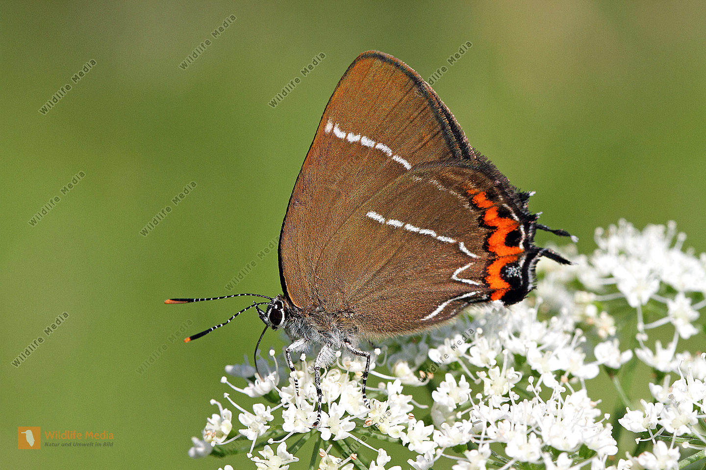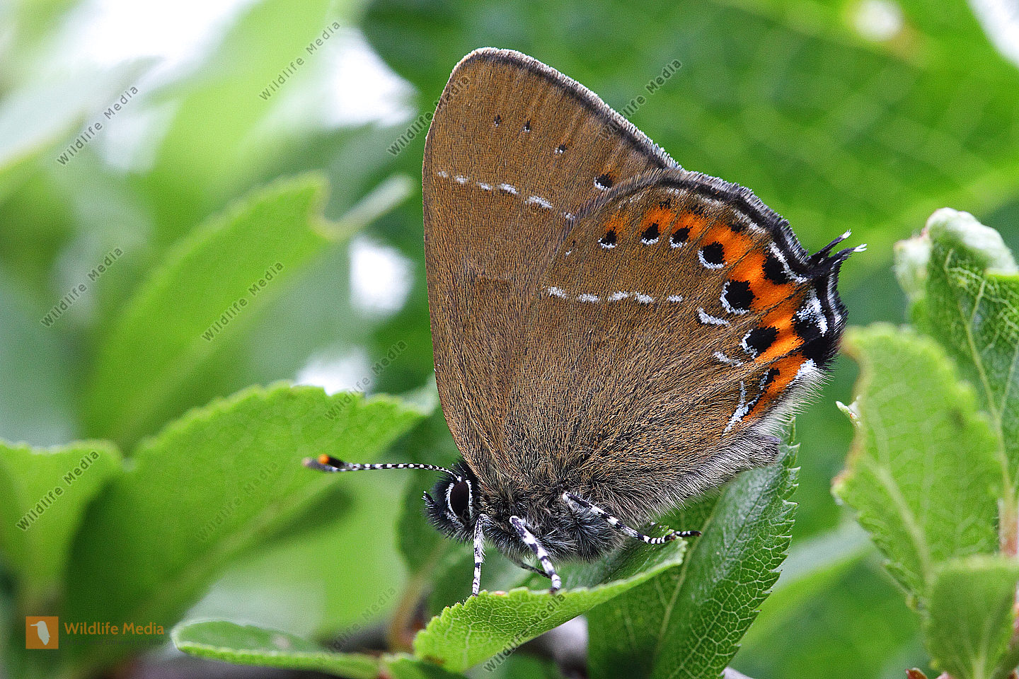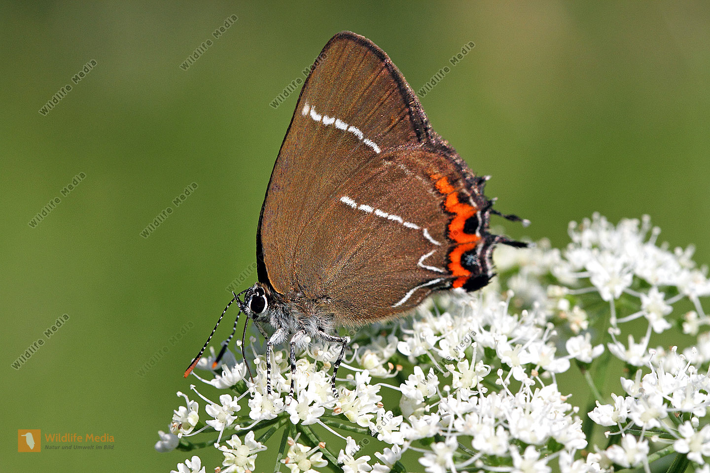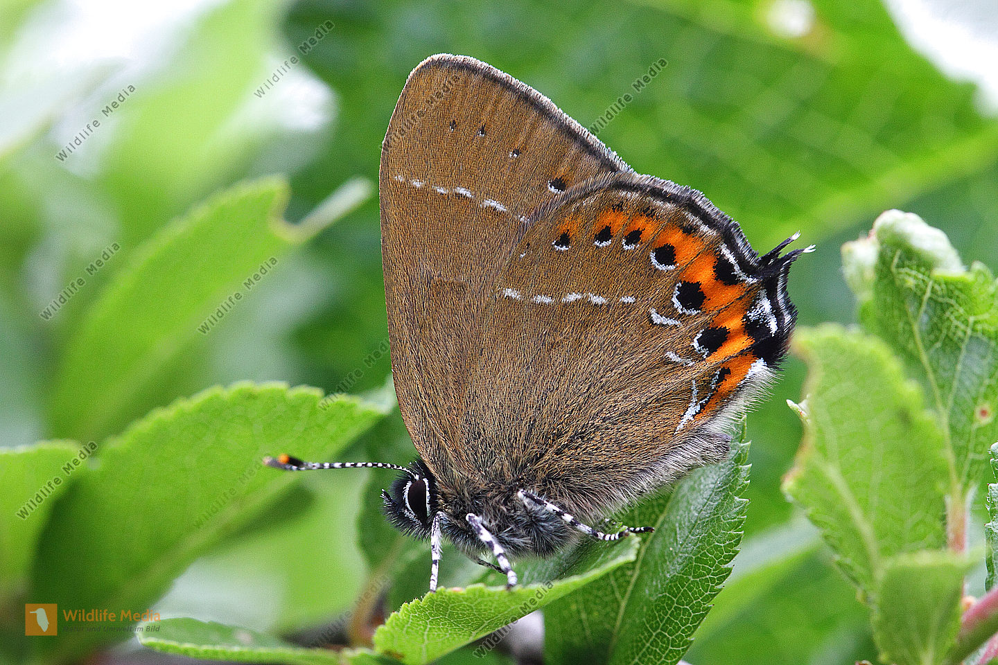 Ein Brombeerzipfelfalter ruht auf einer Hecke