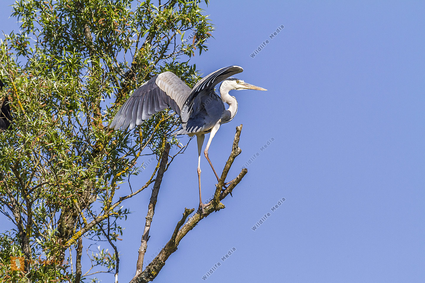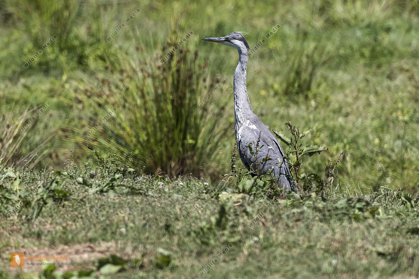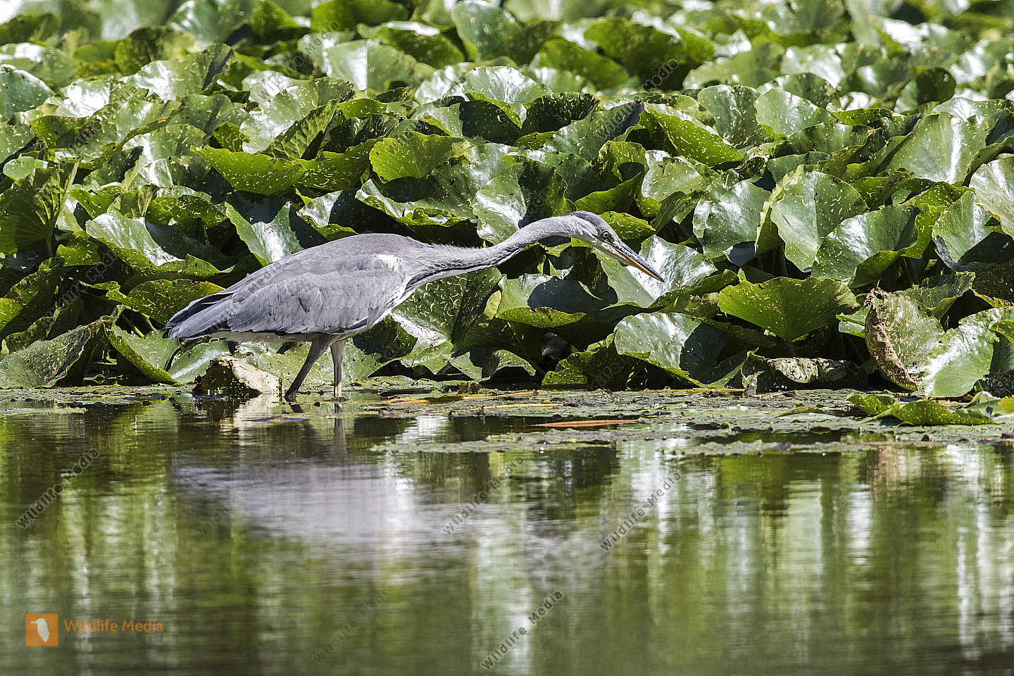 Ein Graureiher auf der Suche nach Nahrung im Beeder Bruch