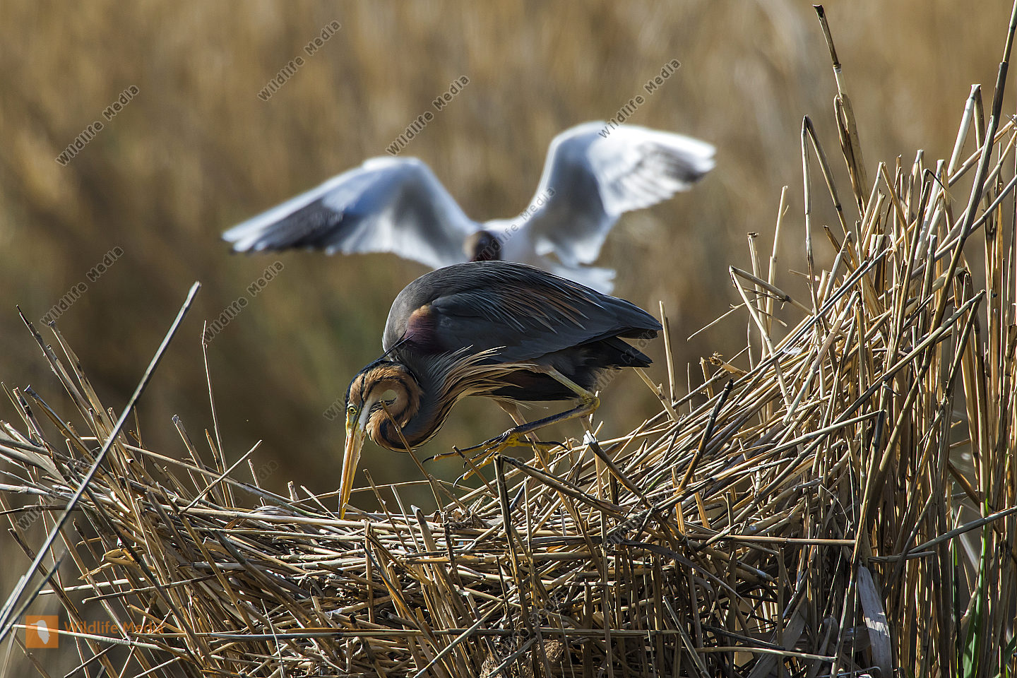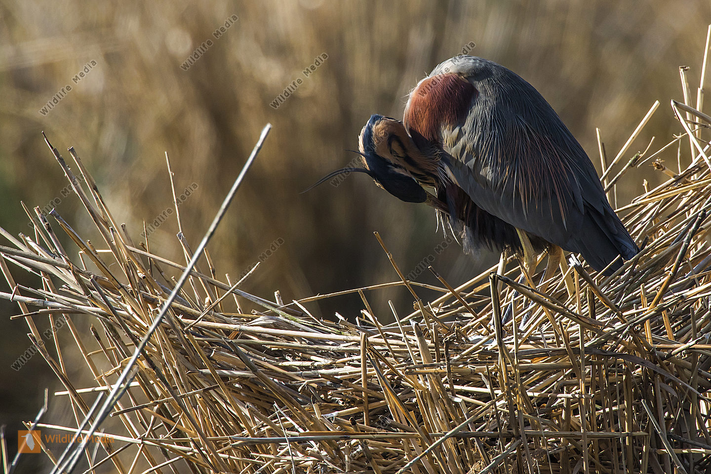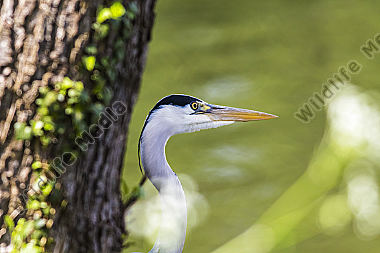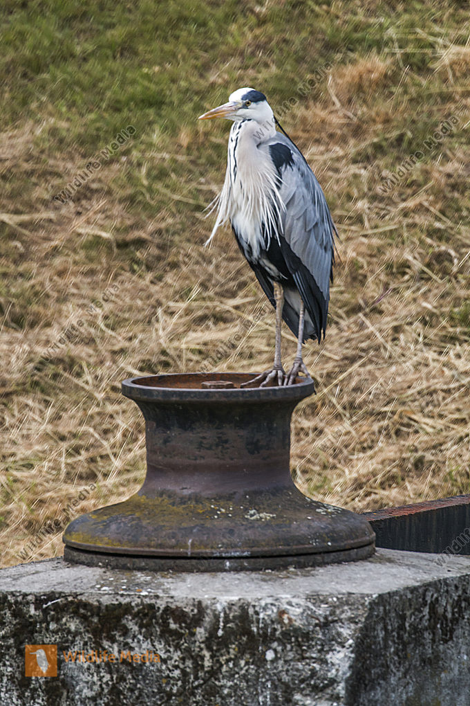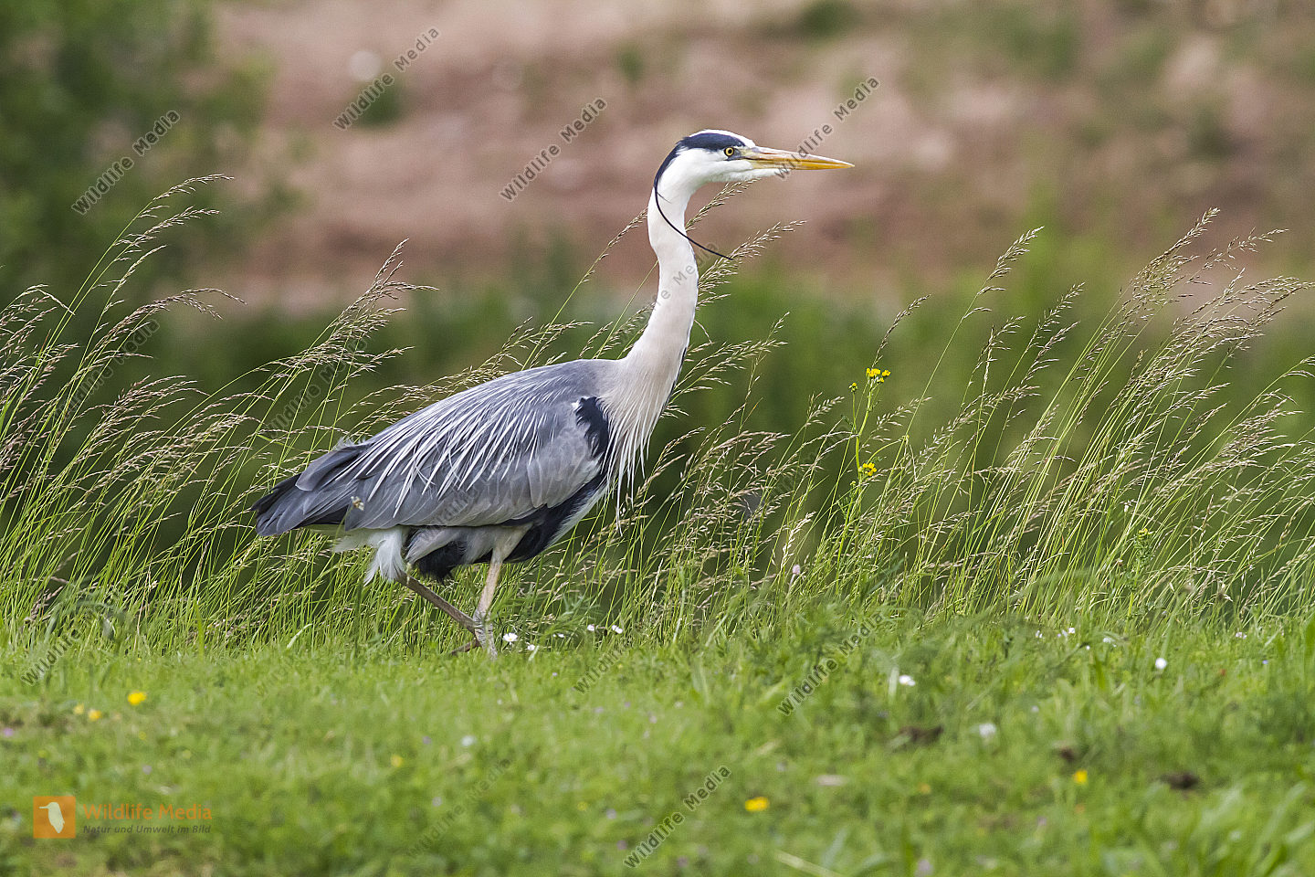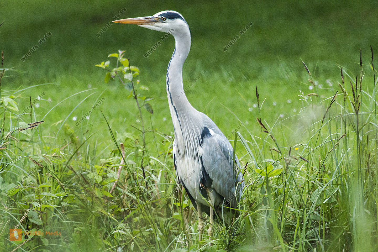 Ein Graureiher auf der Suche nach Nahrung im Beeder Bruch