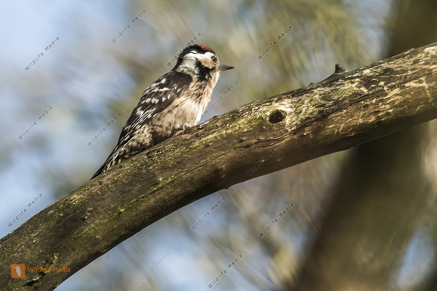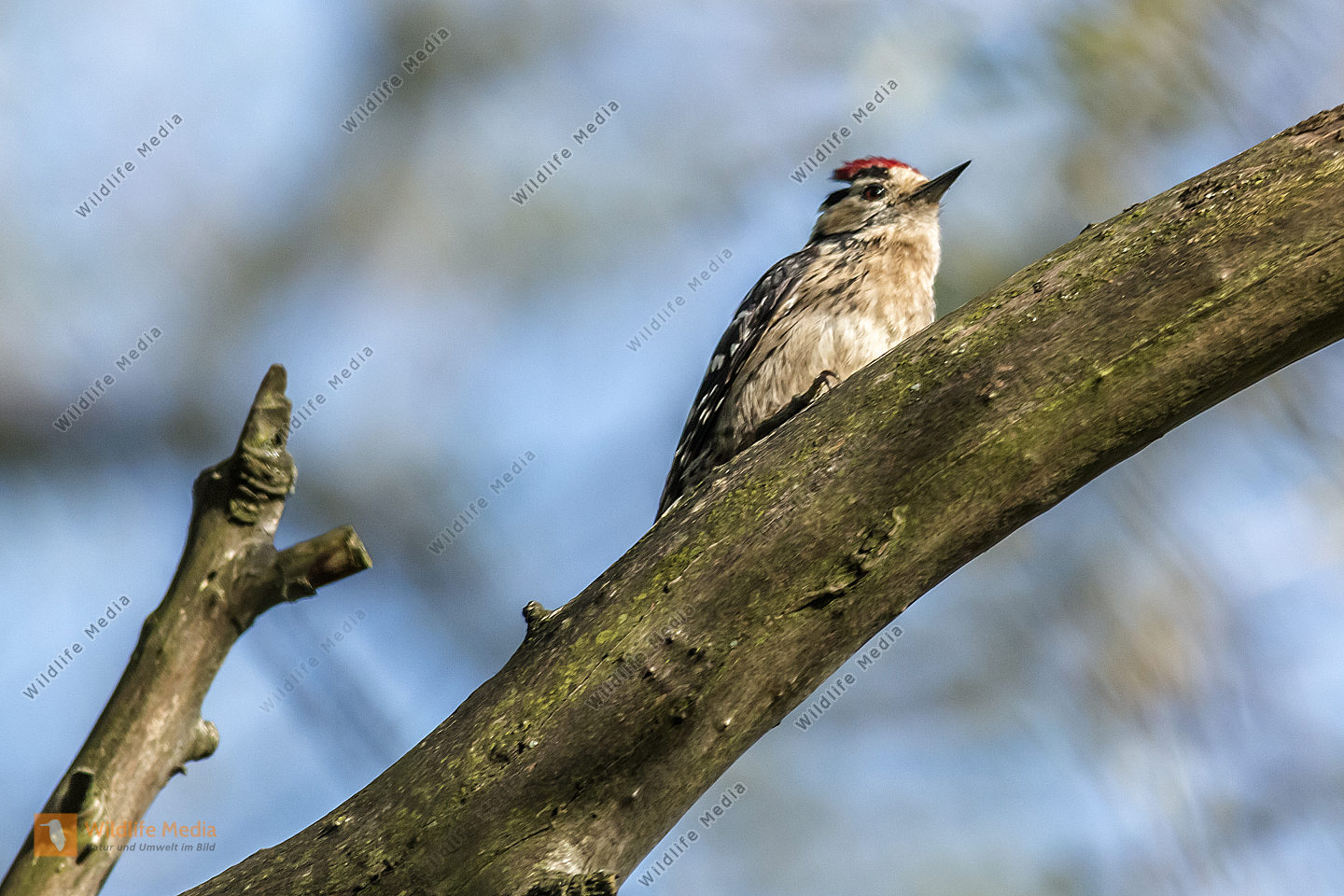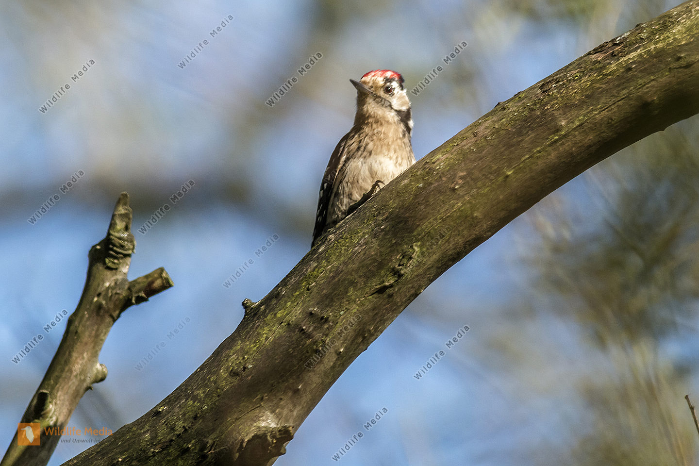 Ein Kleinspecht auf Futtersuche am Baumstamm