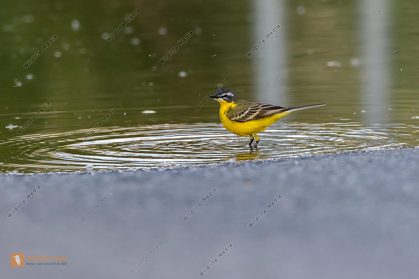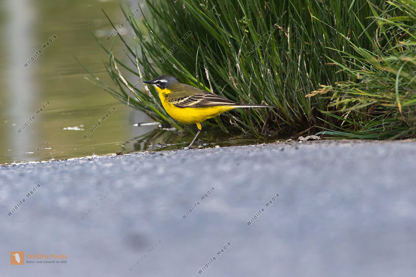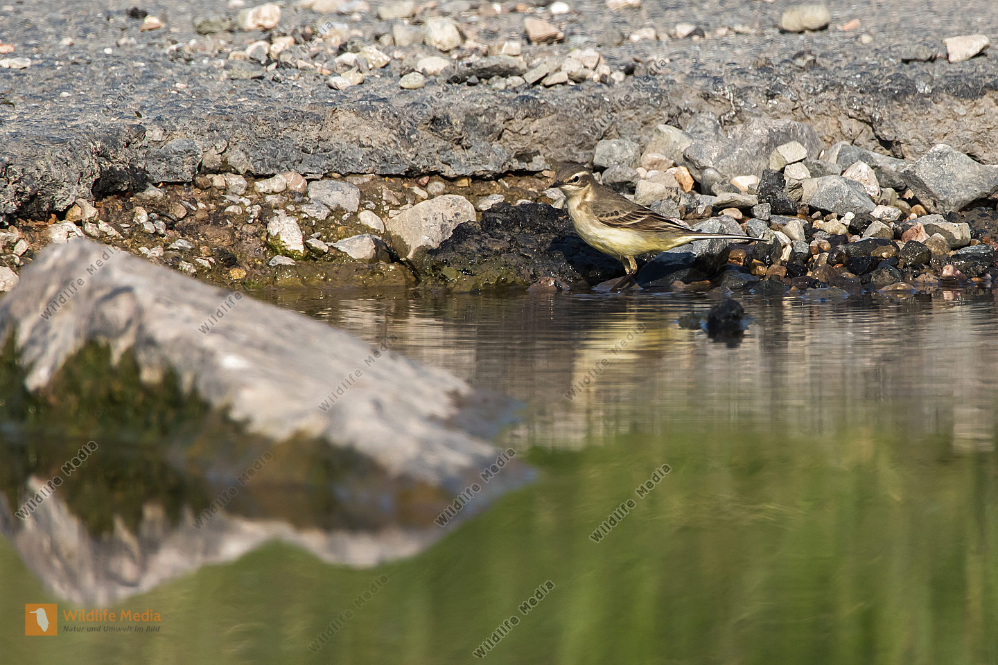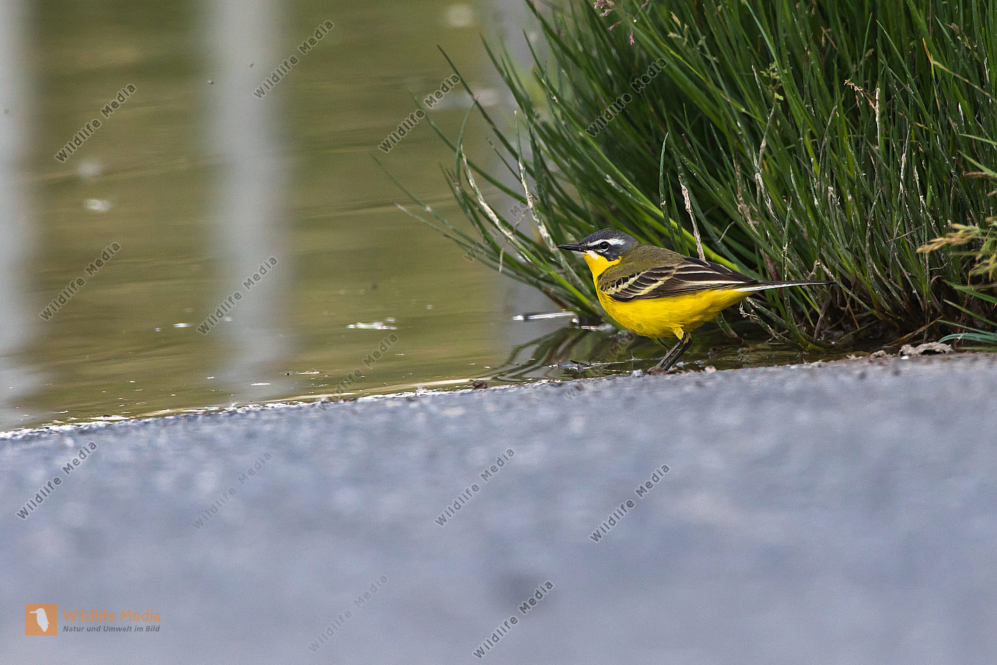 Eine Bachstelze am Bachufer auf Nahrungssuche