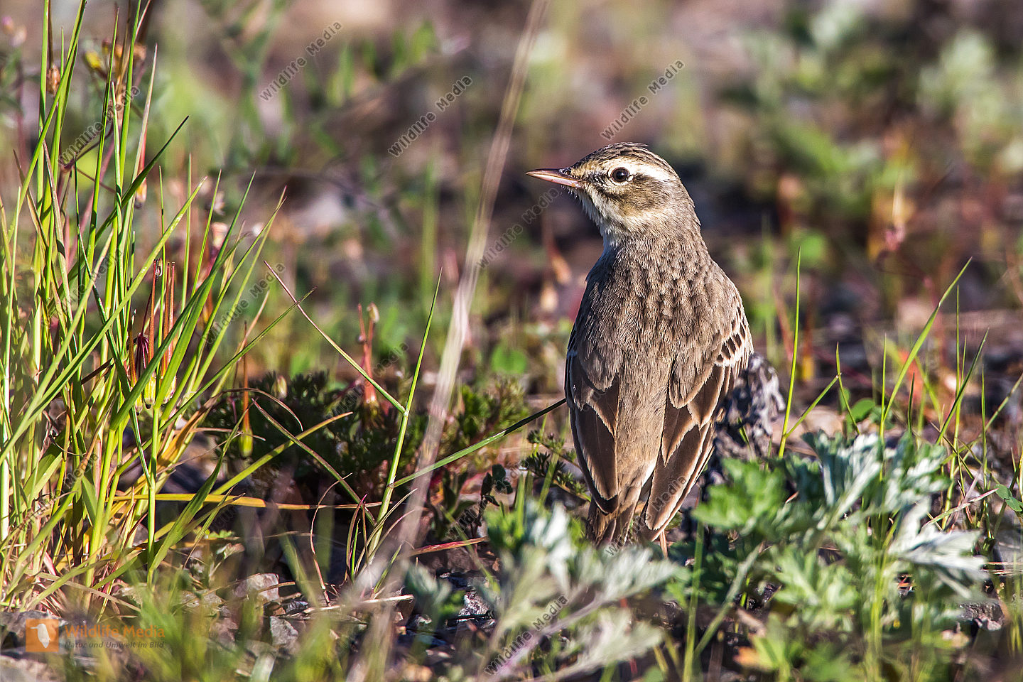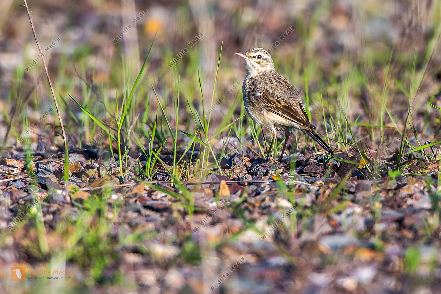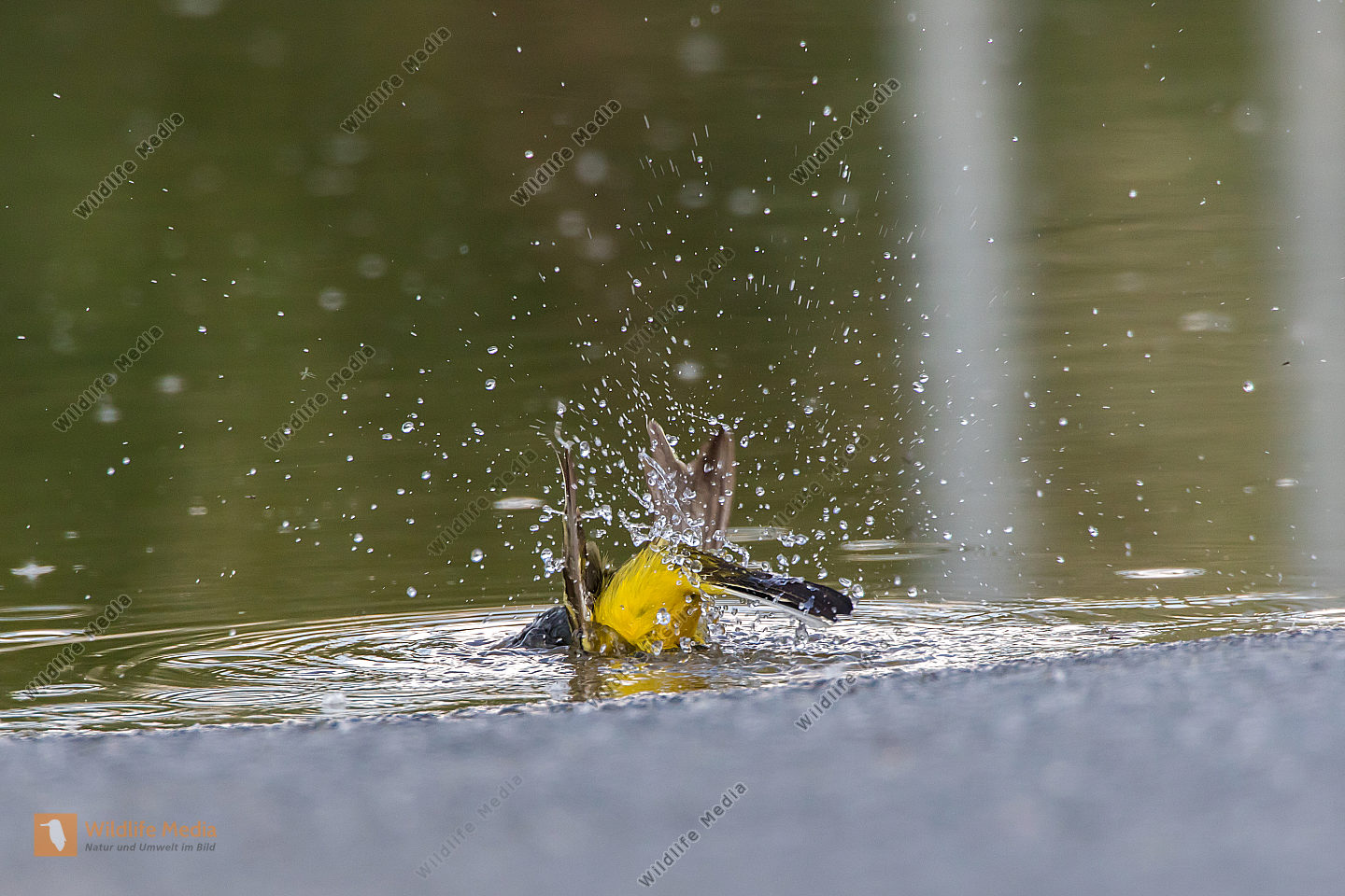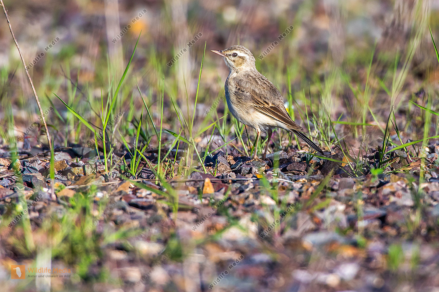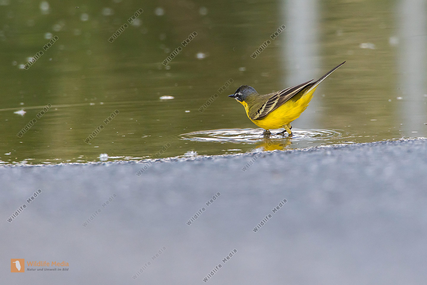 Eine Bachstelze am Bachufer auf Nahrungssuche