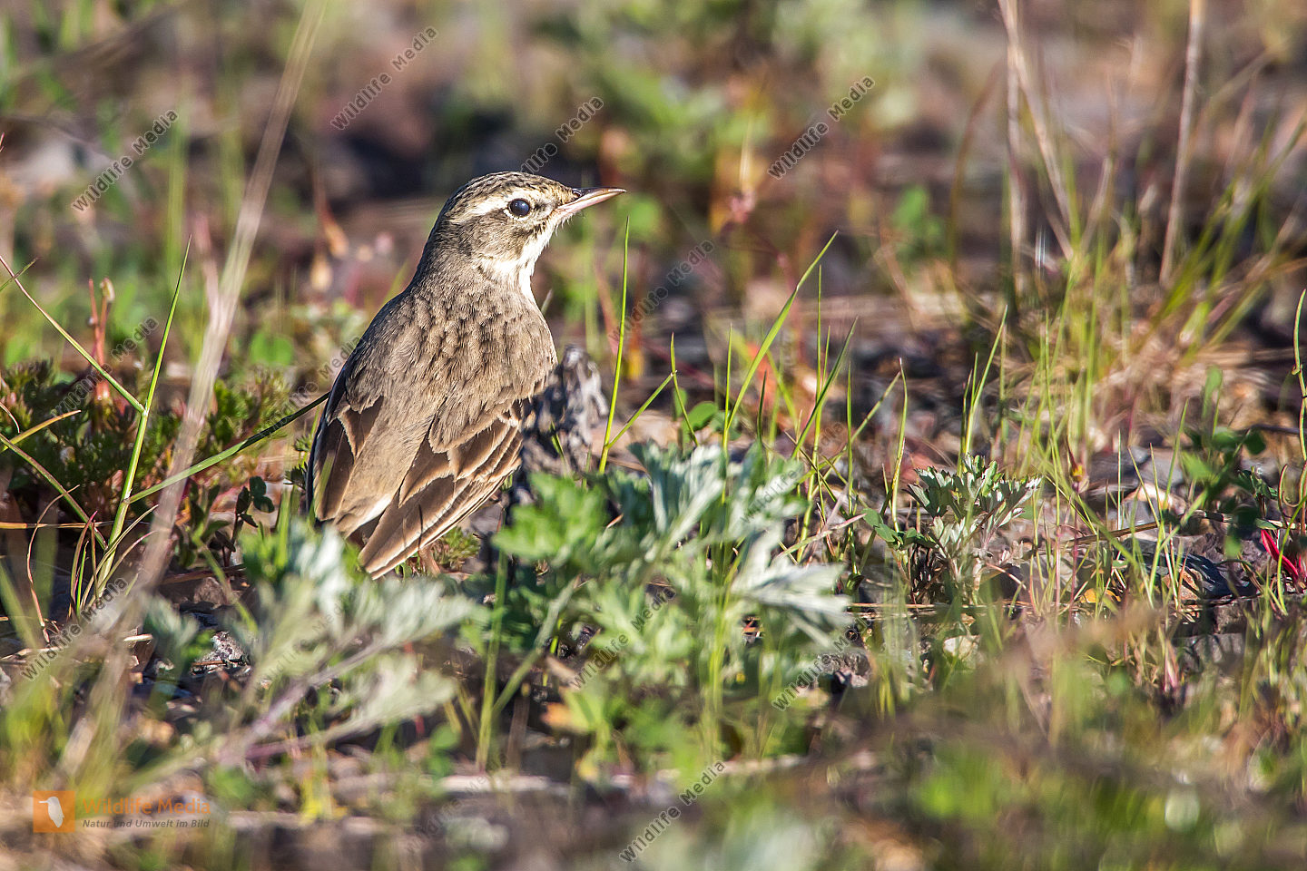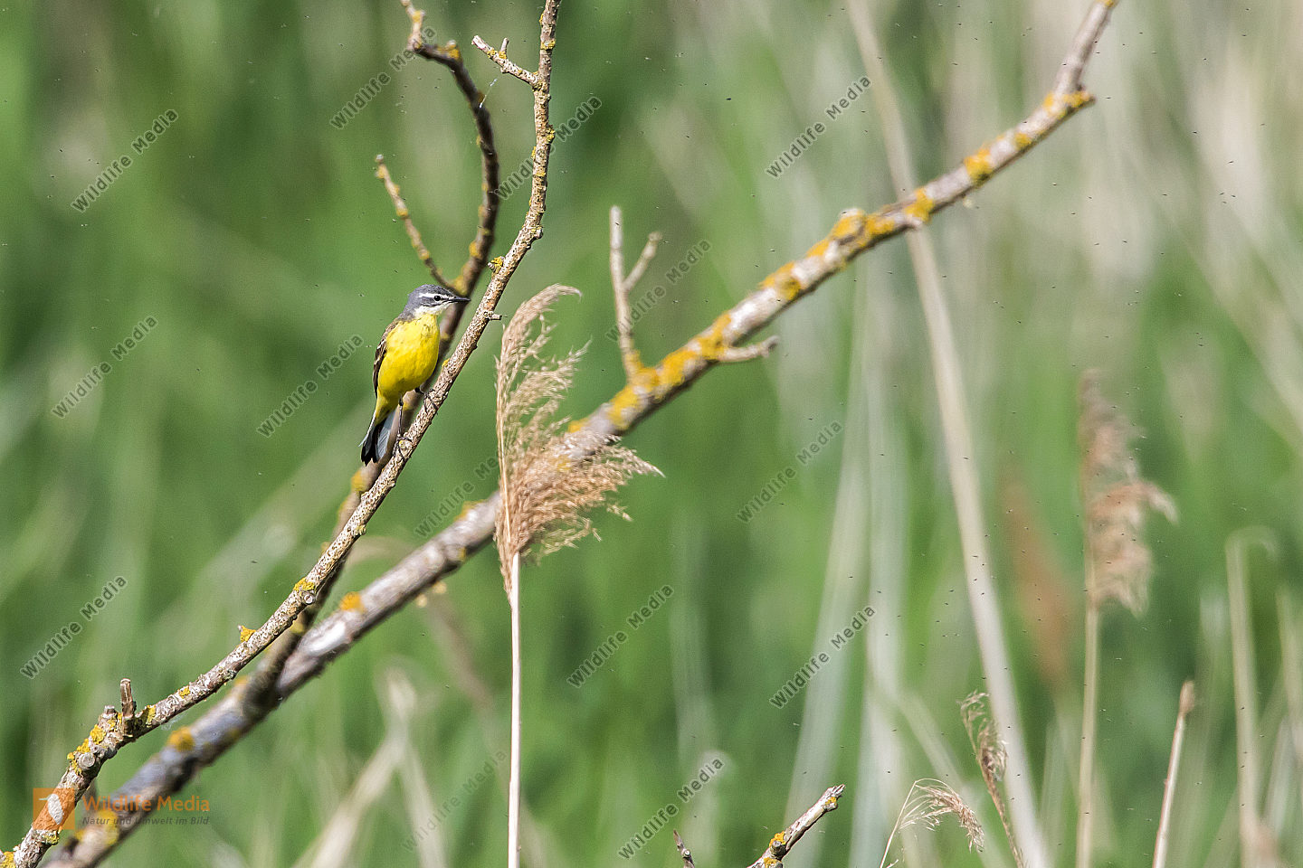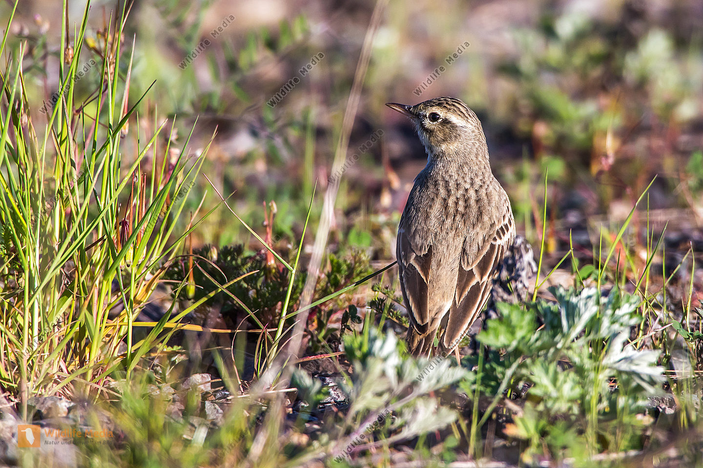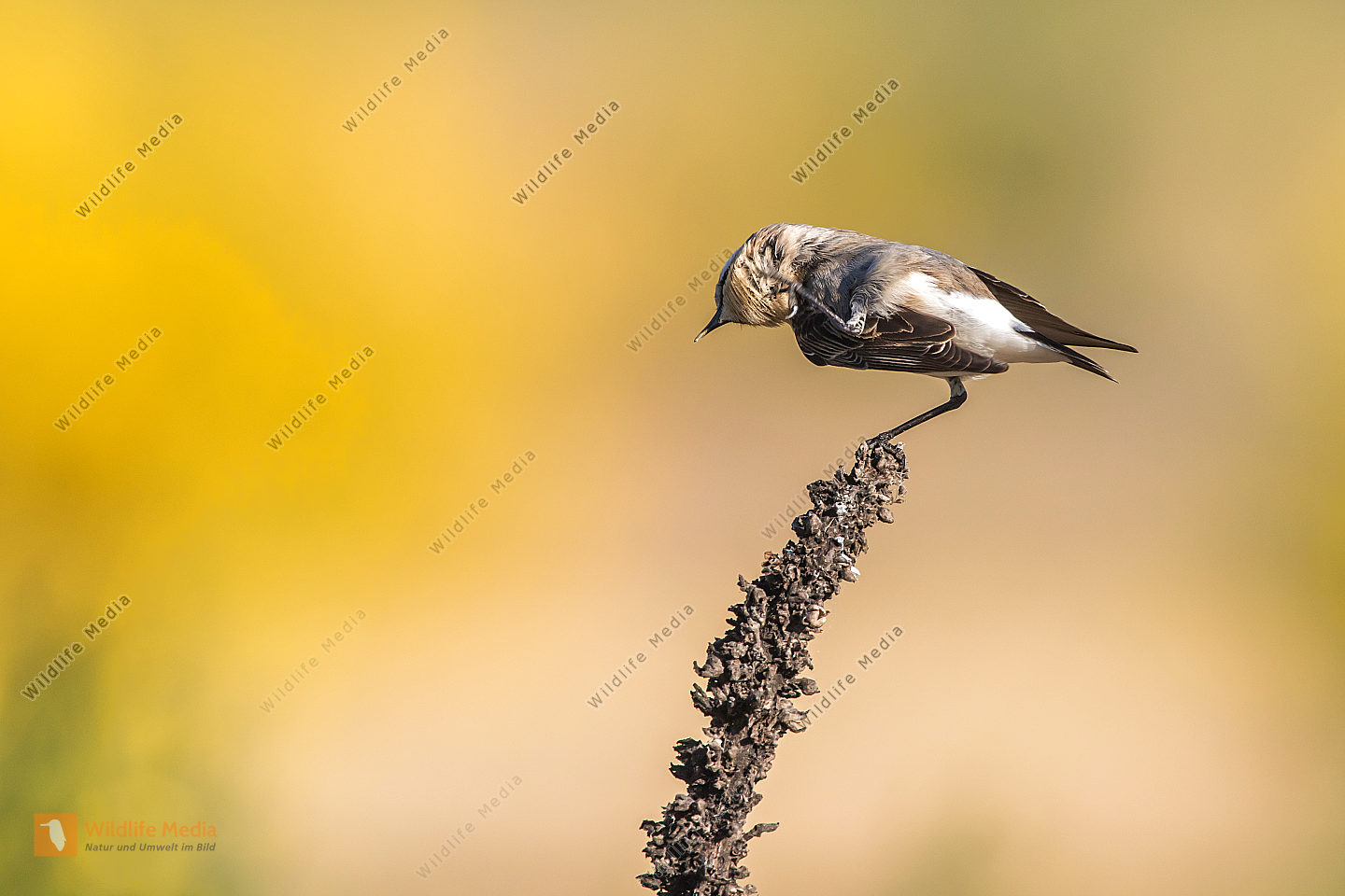 Eine Bachstelze am Bachufer auf Nahrungssuche