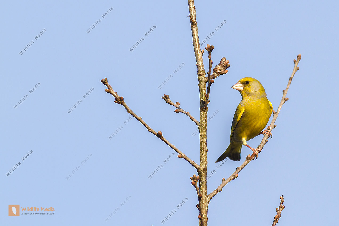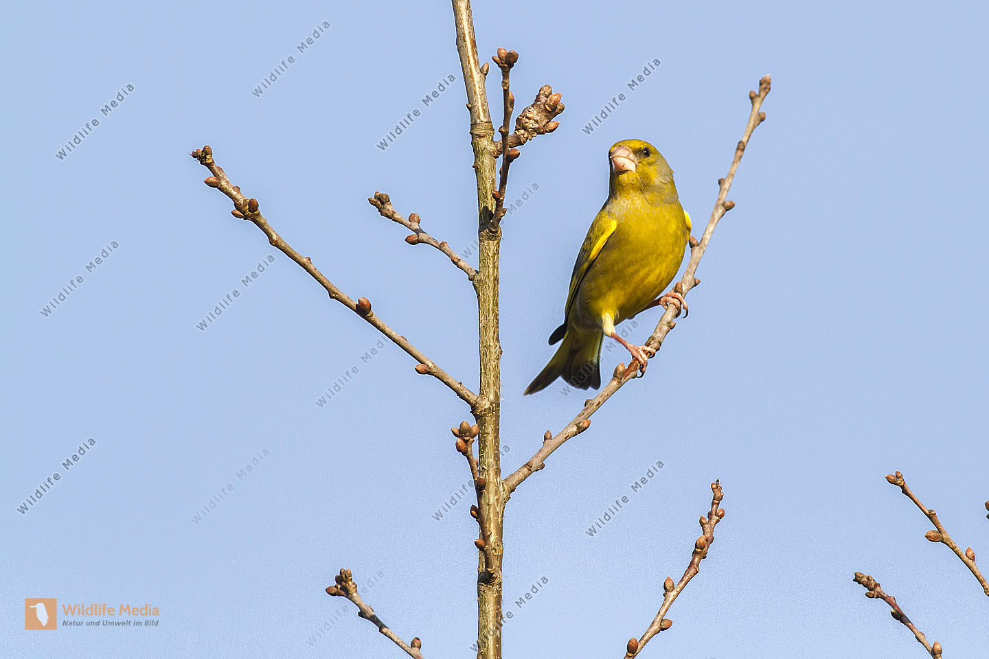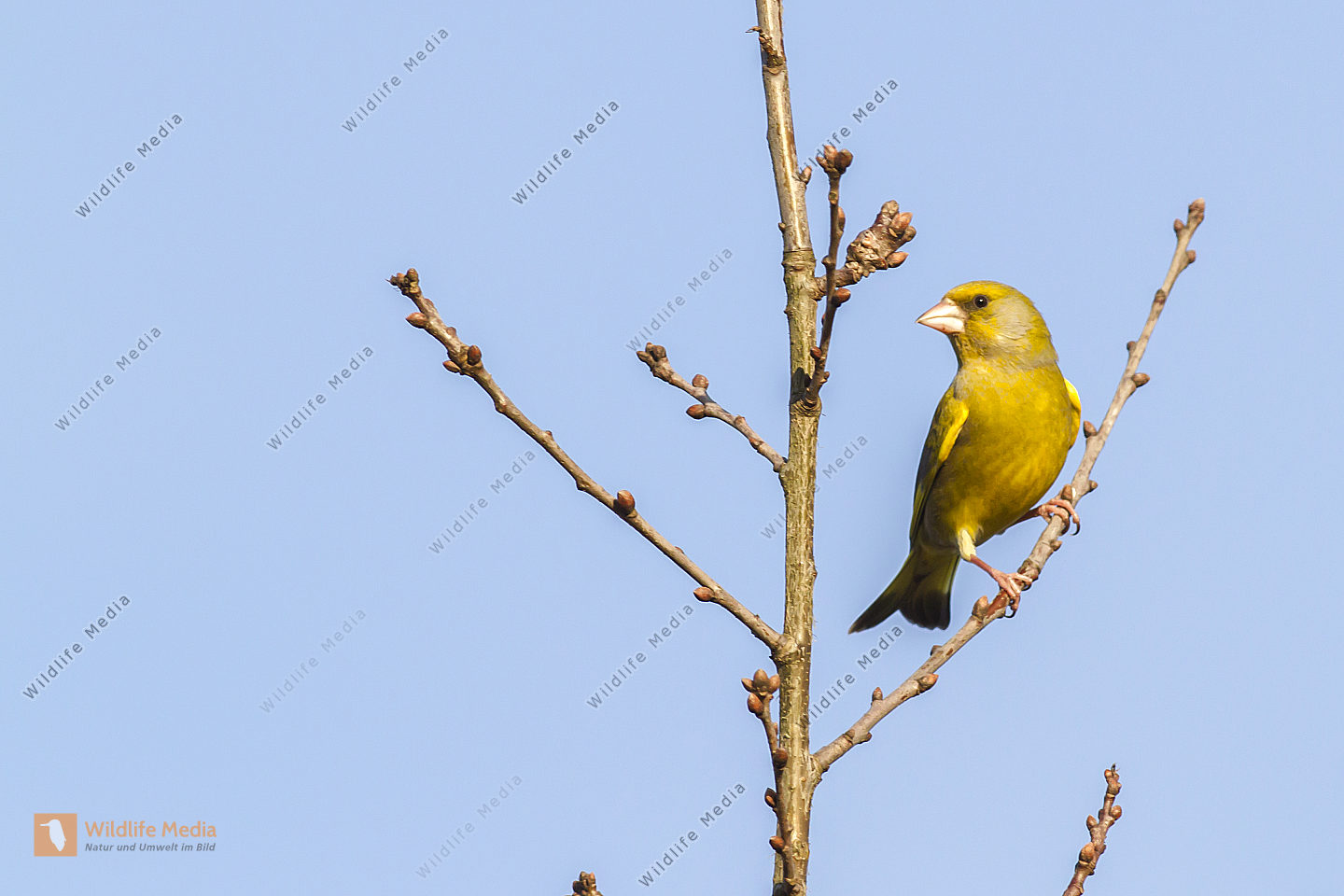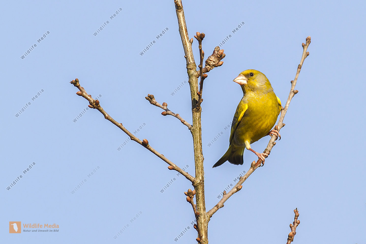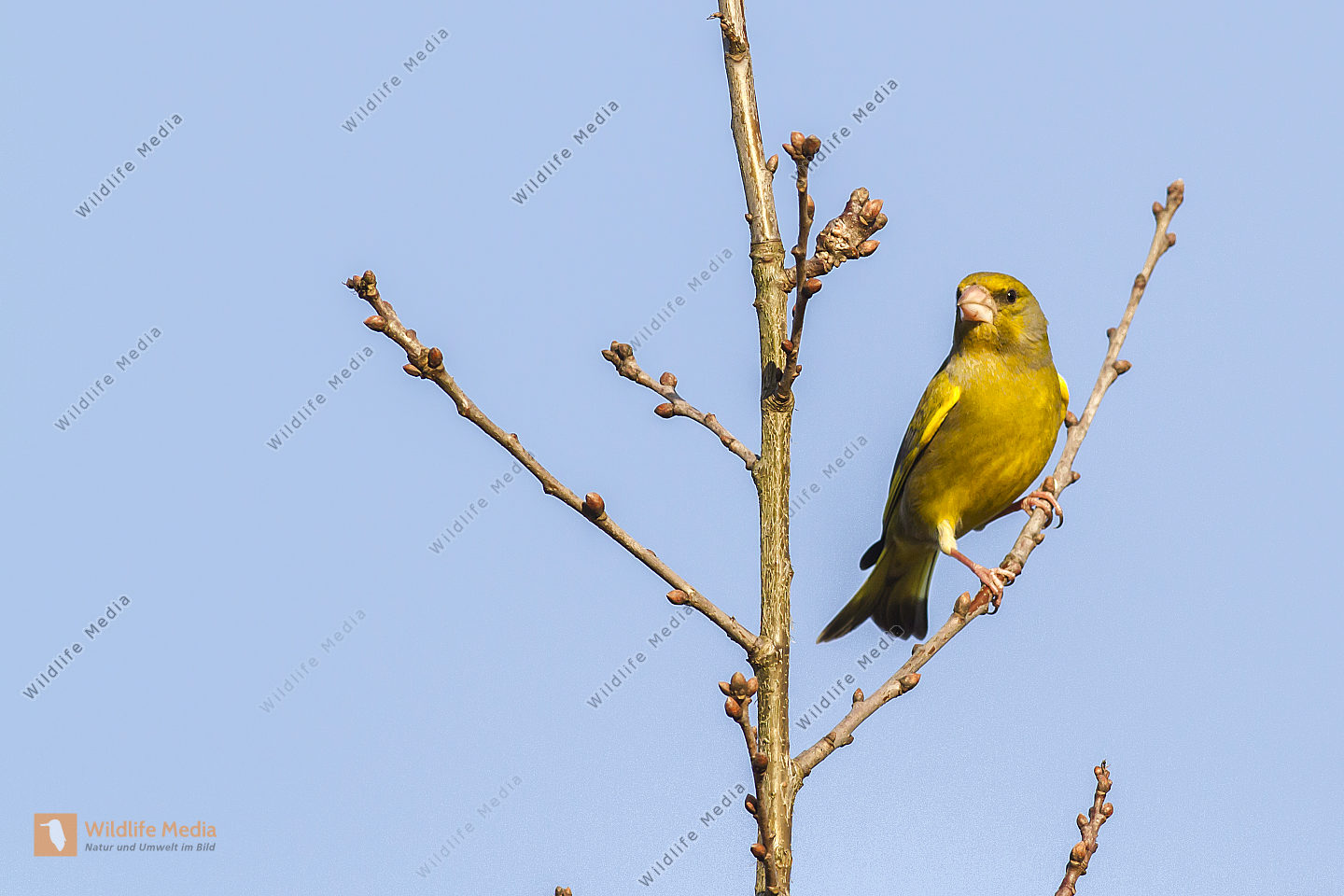 Ein Grünfink vor blauen Himel sitzt auf einem Ast