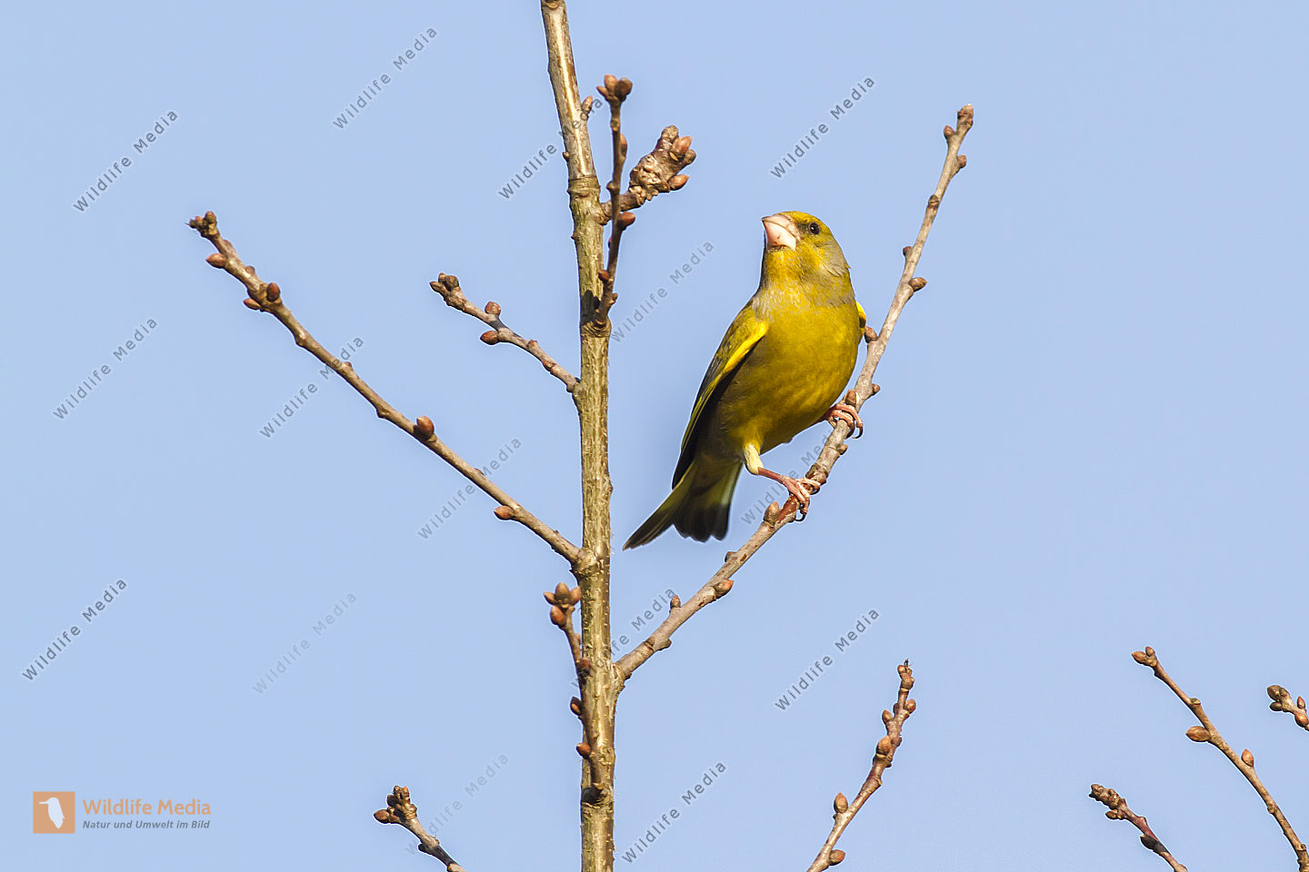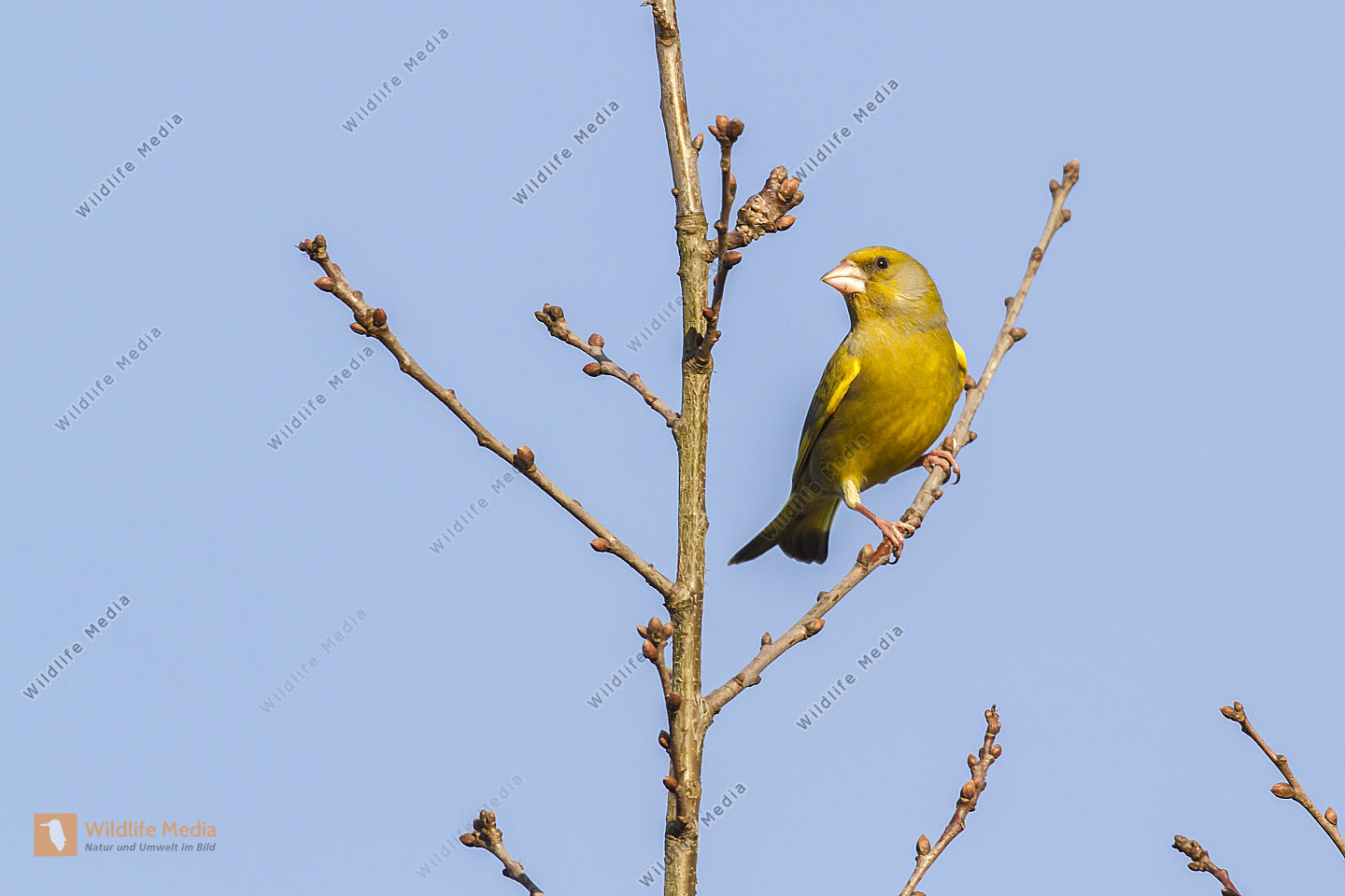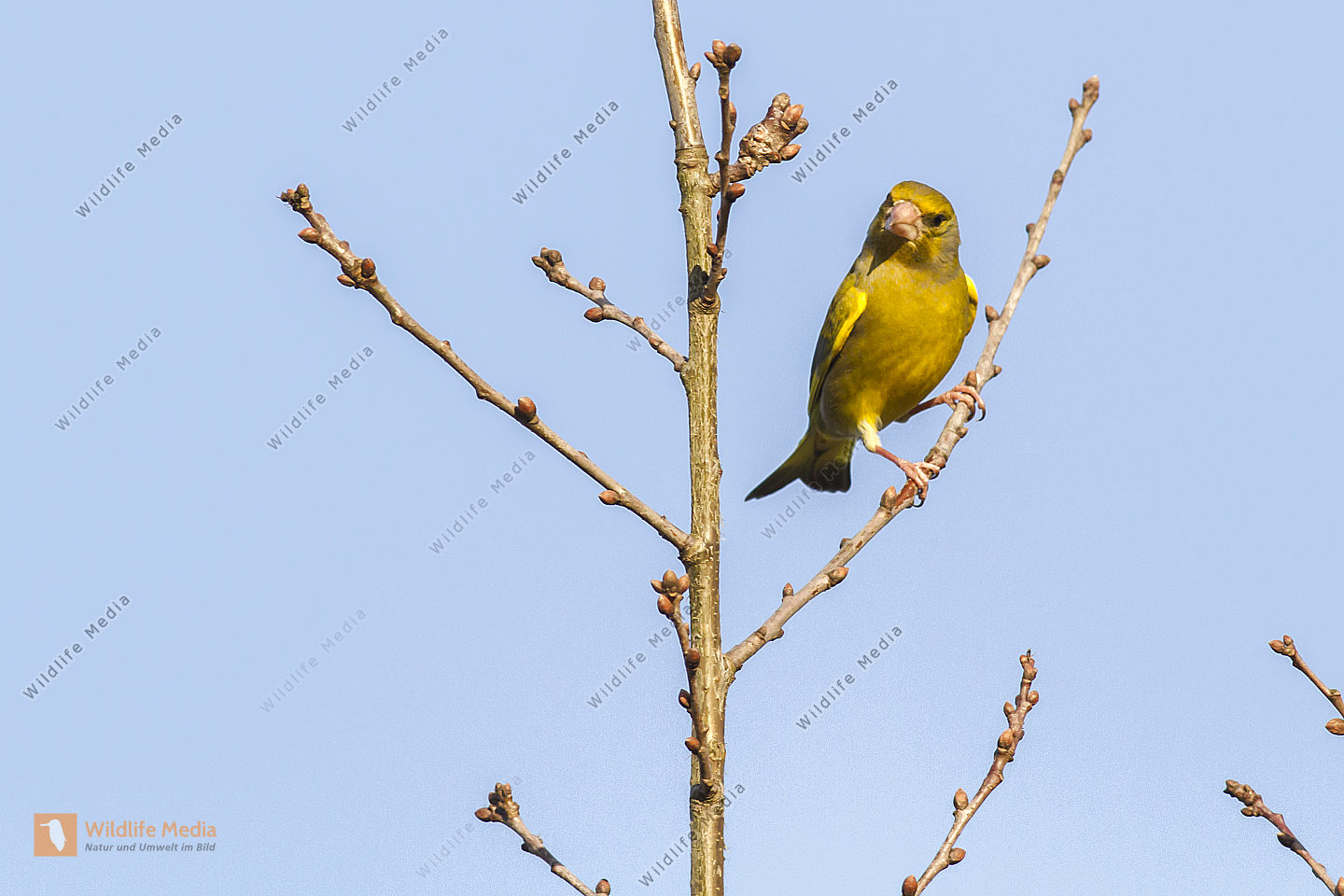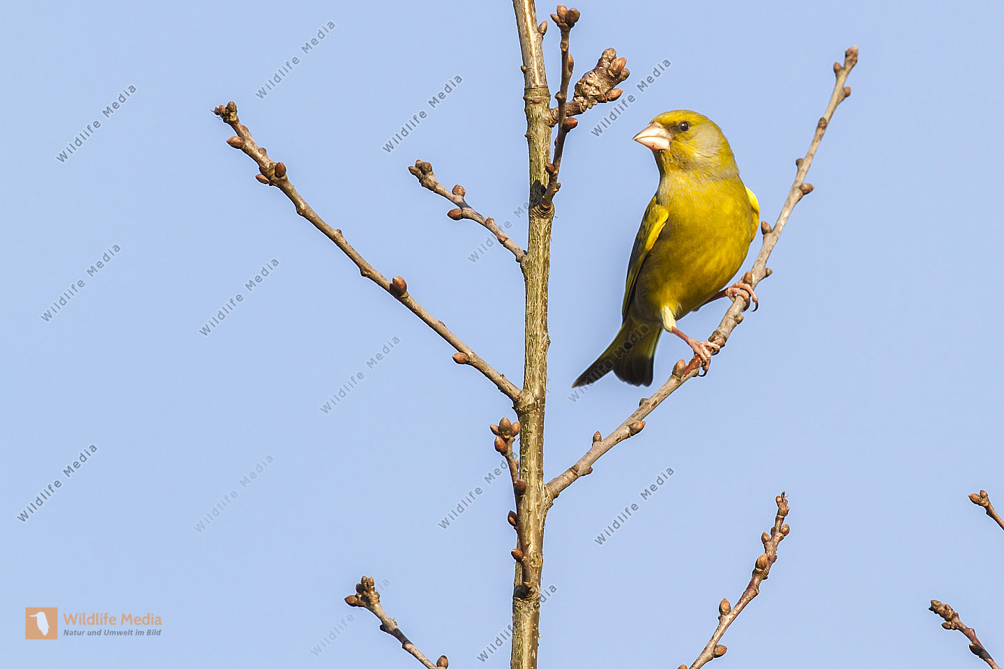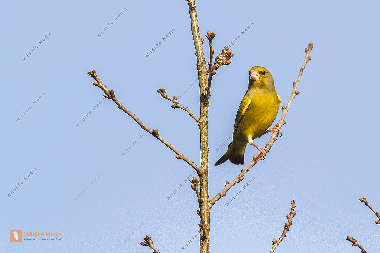 Ein Grünfink vor blauen Himel sitzt auf einem Ast