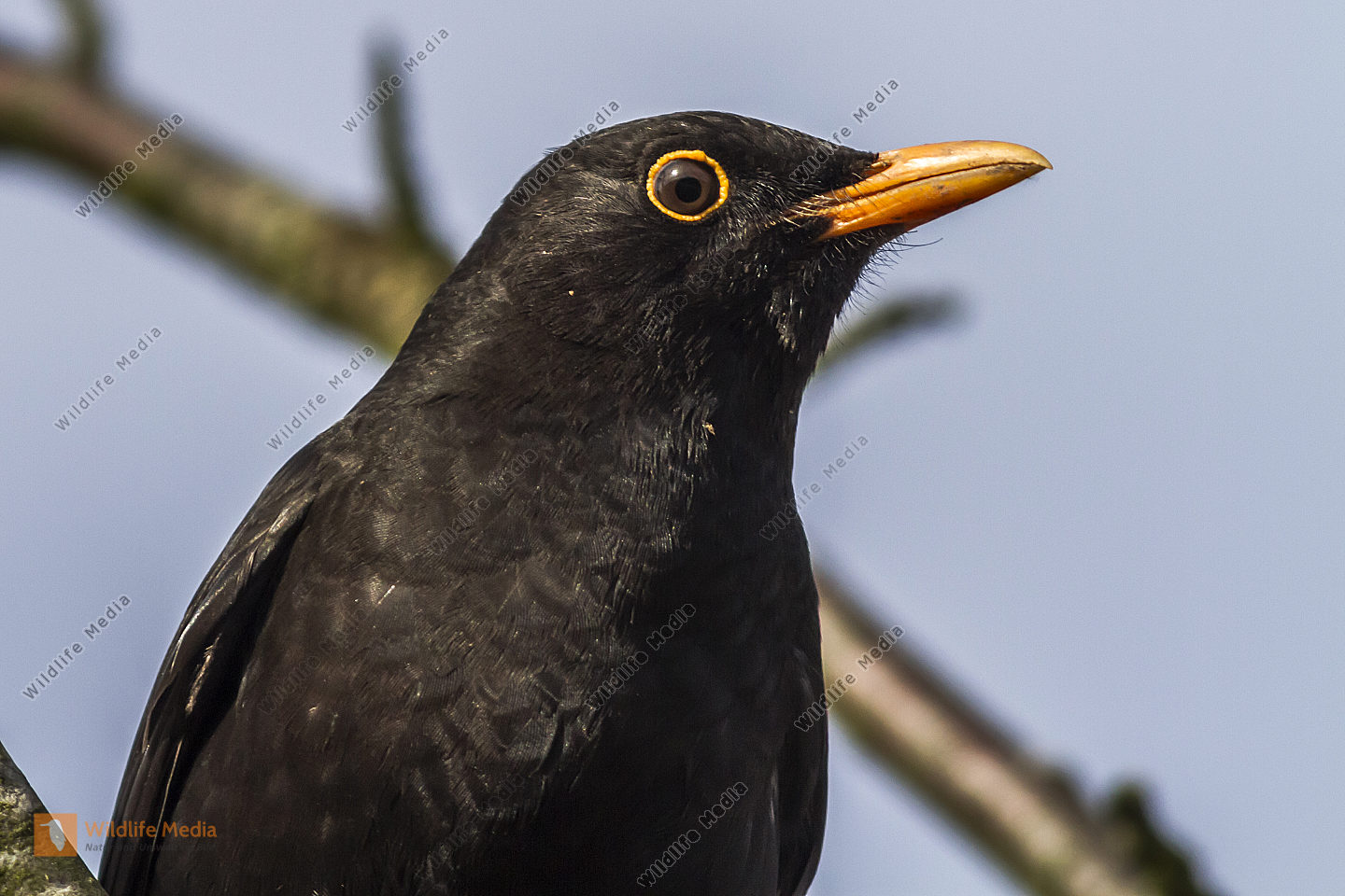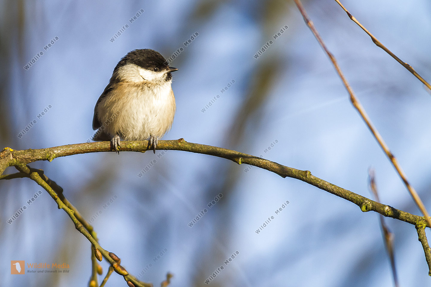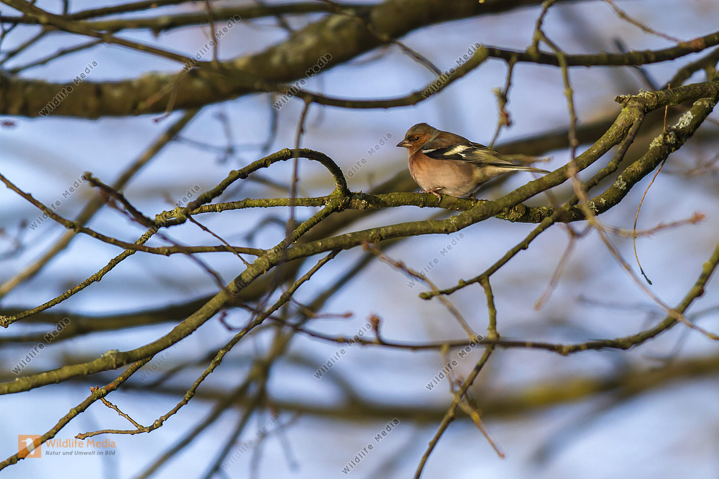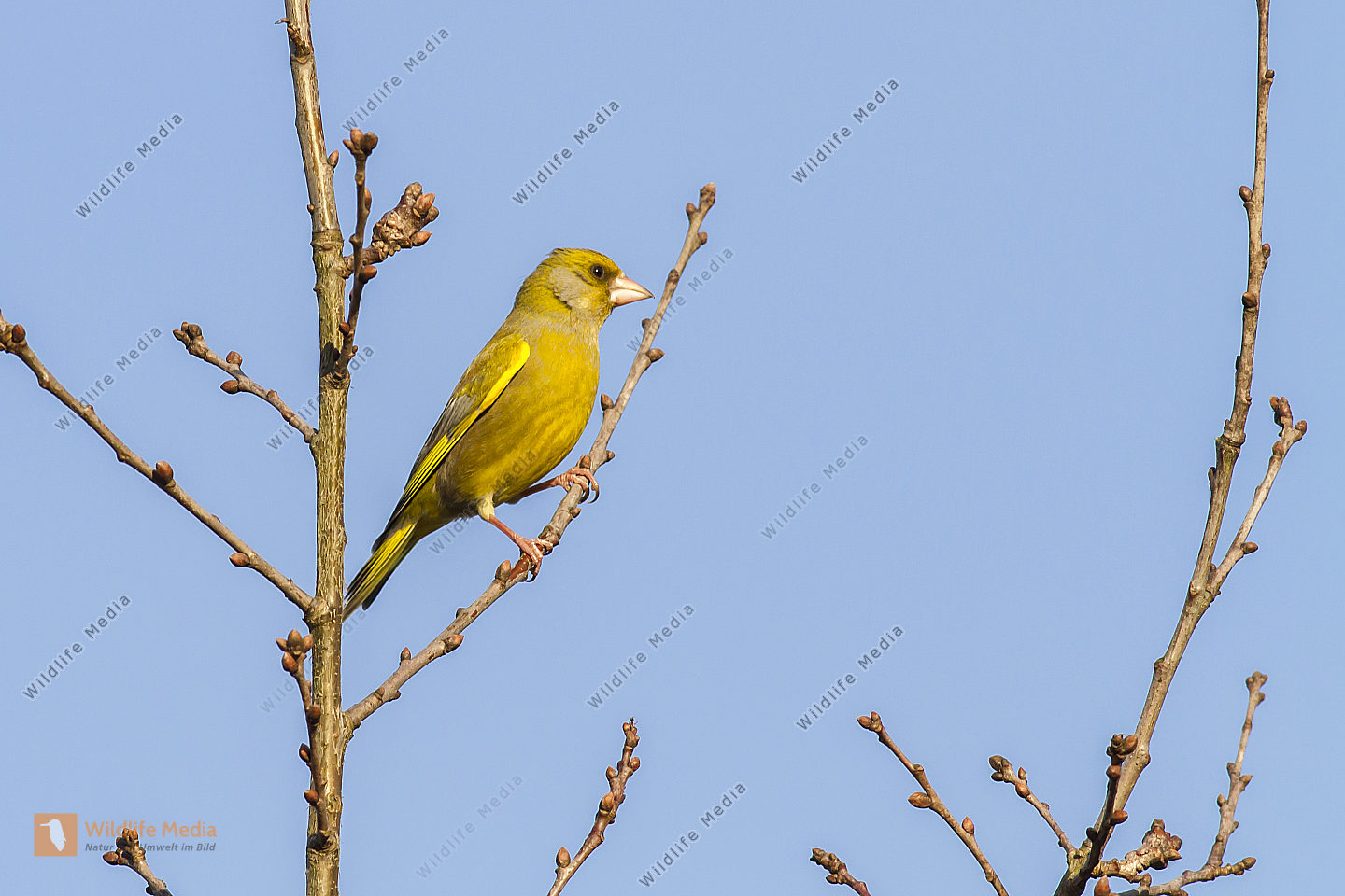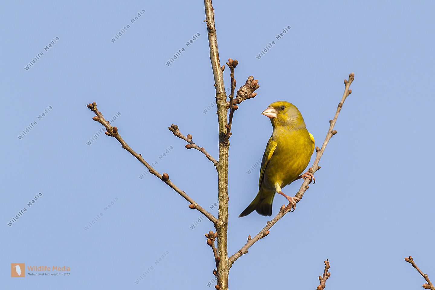 Ein Grünfink vor blauen Himel sitzt auf einem Ast