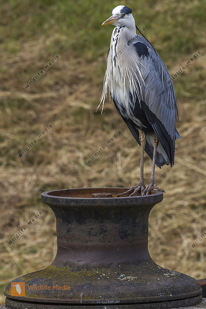 Ein Graureiher auf der Suche nach Nahrung im Beeder Bruch