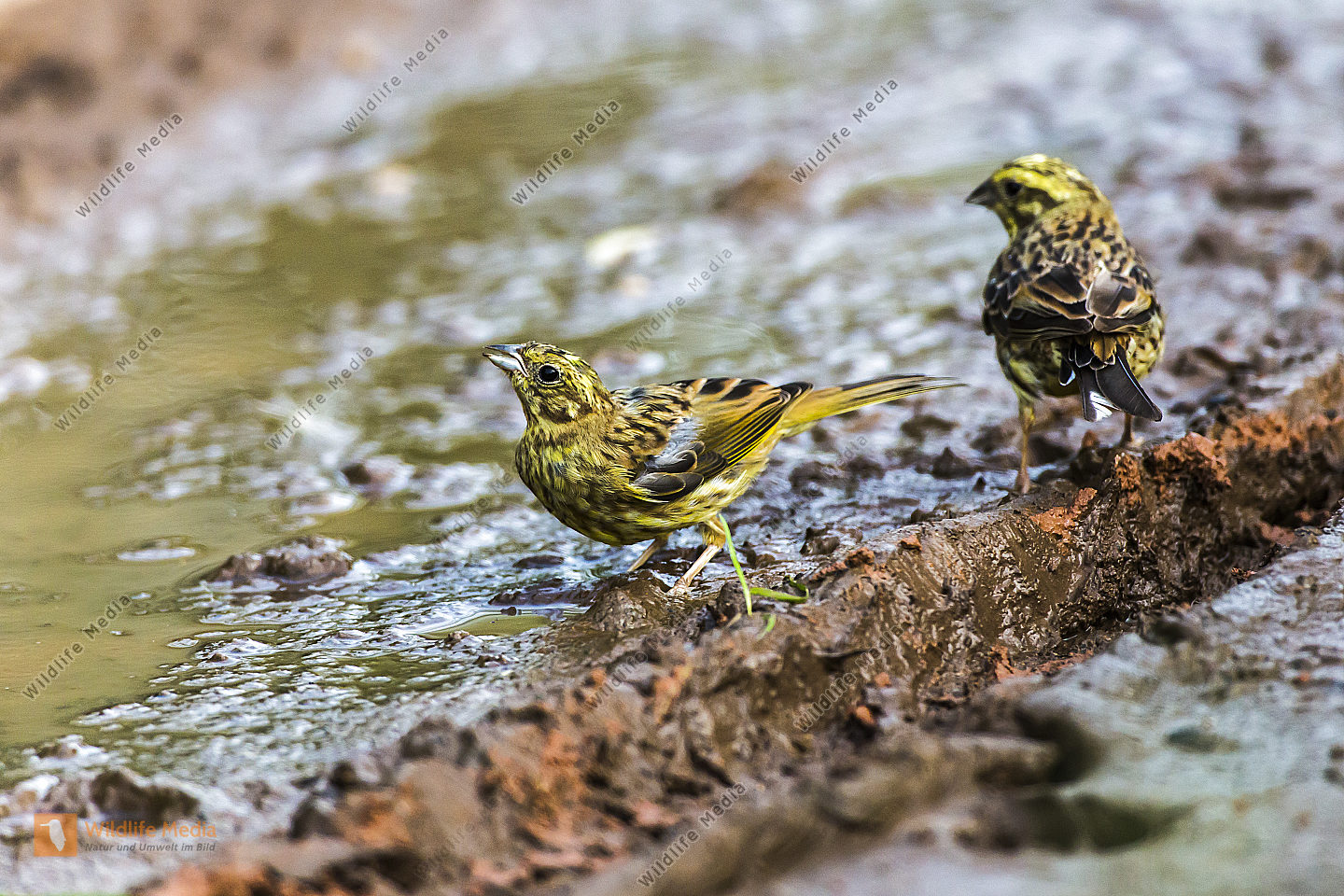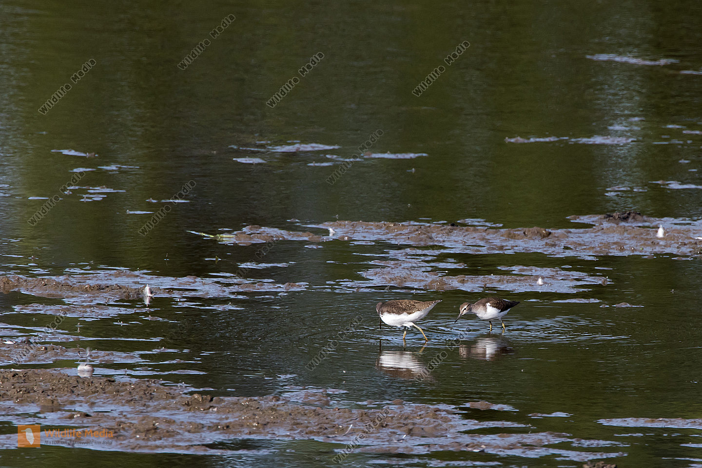 Eine männliche links und eine weibliche Krickente rechts treiben auf dem Ökosee im saarländischen Di
