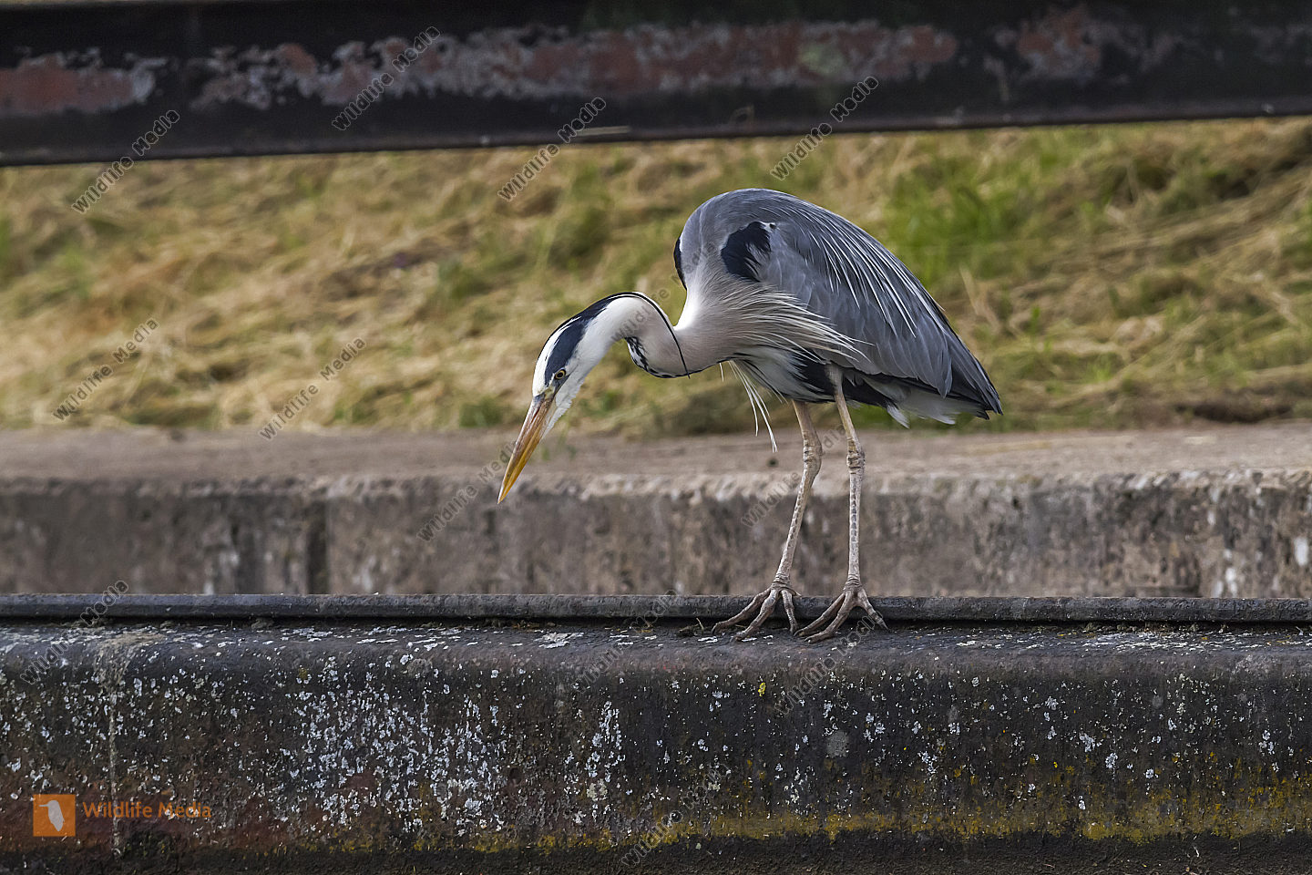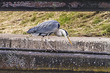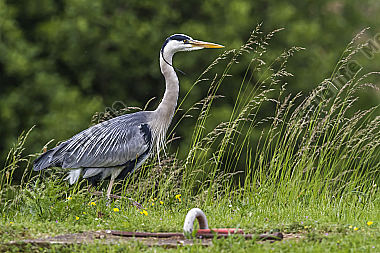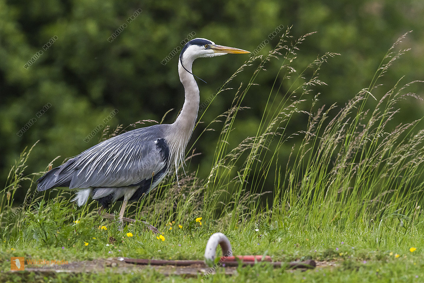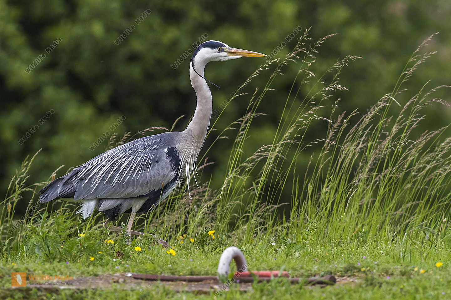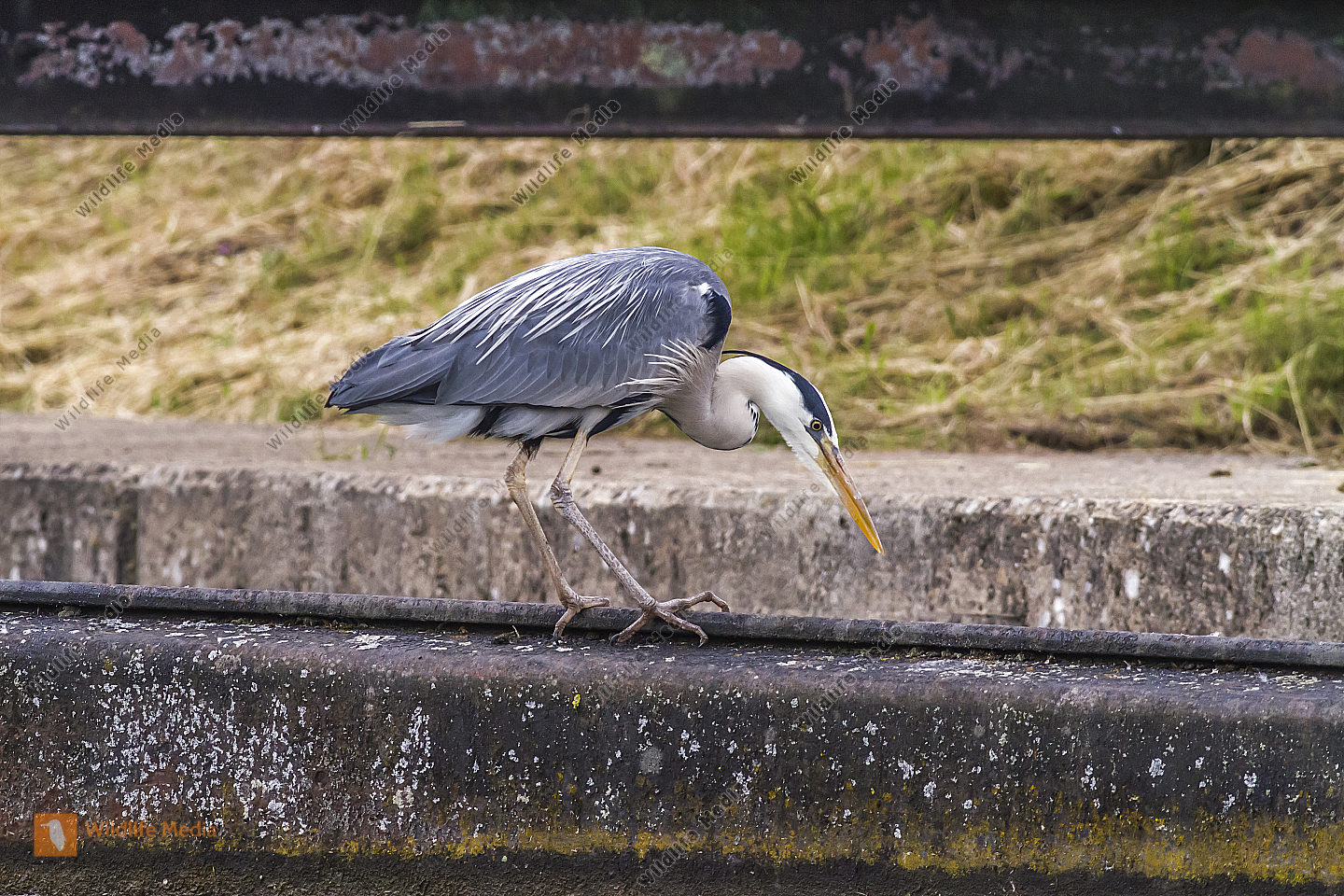 Ein Graureiher auf der Suche nach Nahrung im Beeder Bruch
