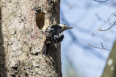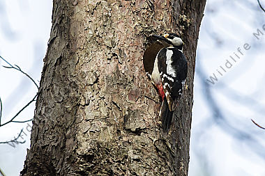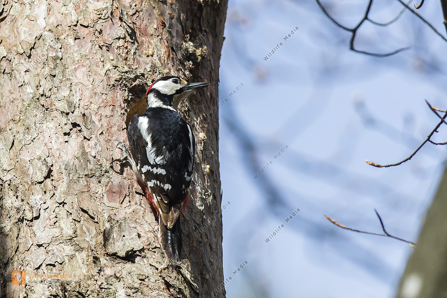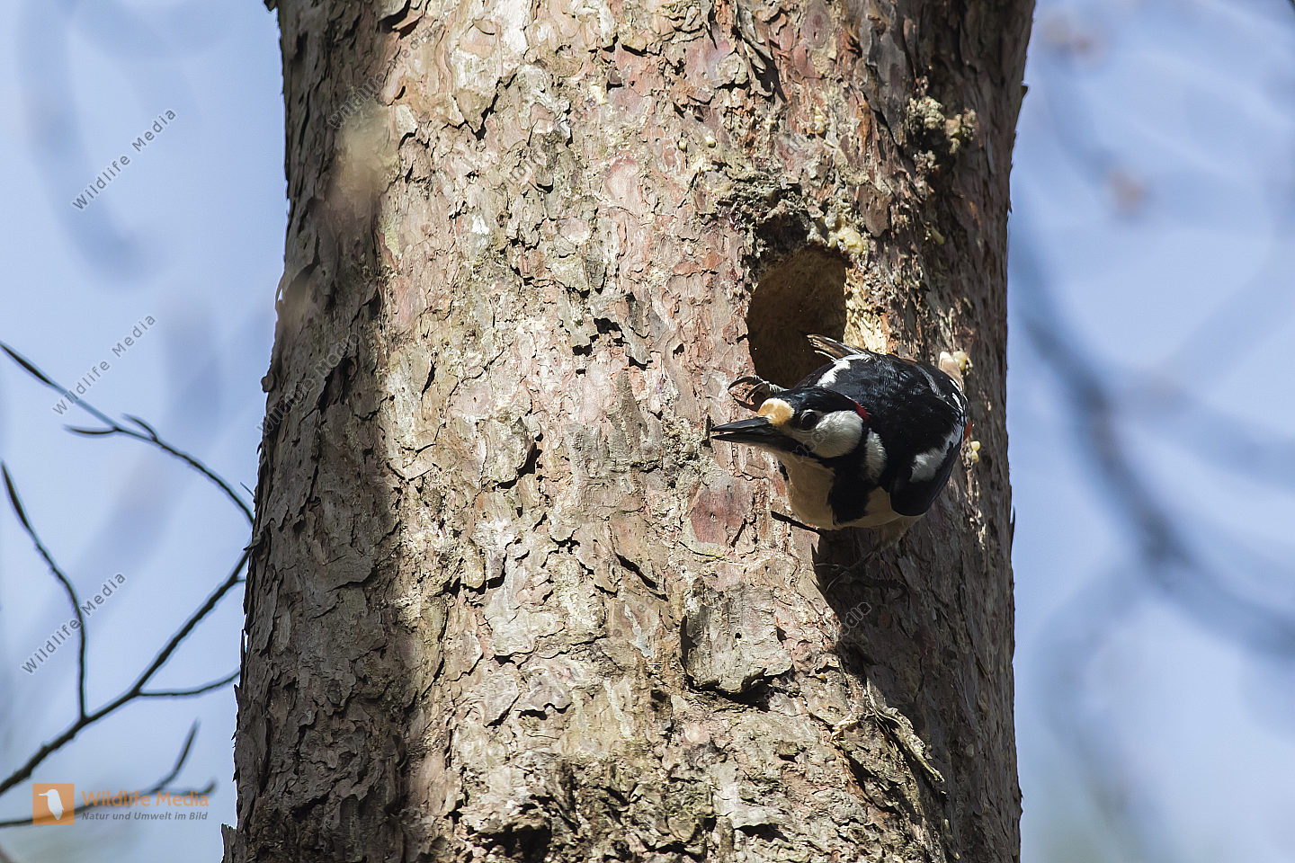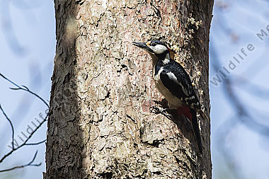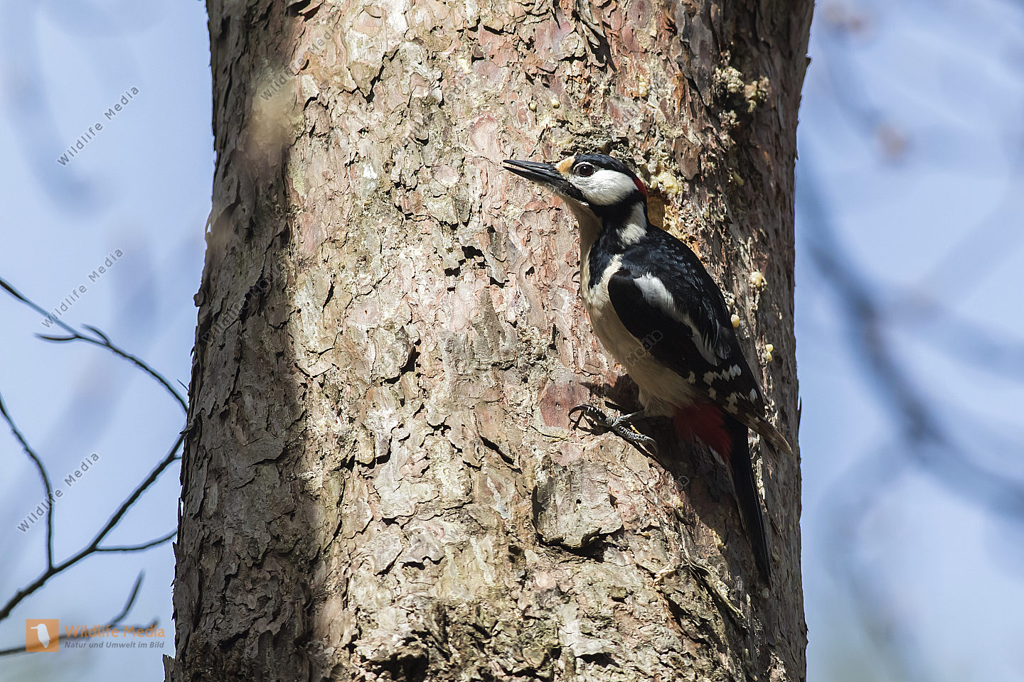 Ein Kleinspecht auf Futtersuche am Baumstamm