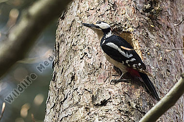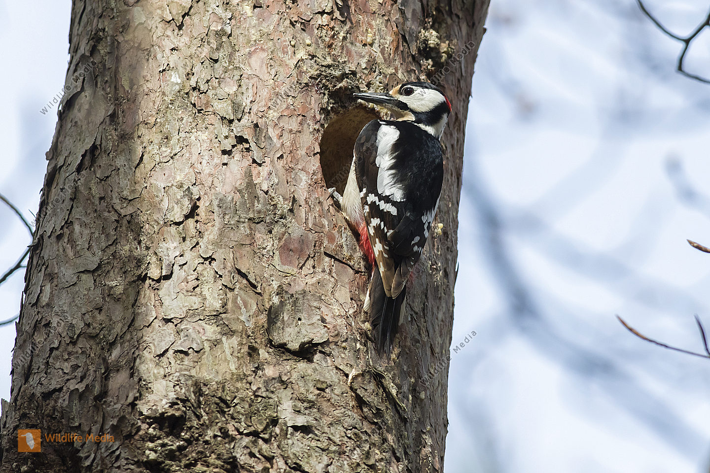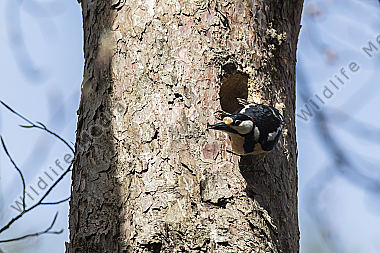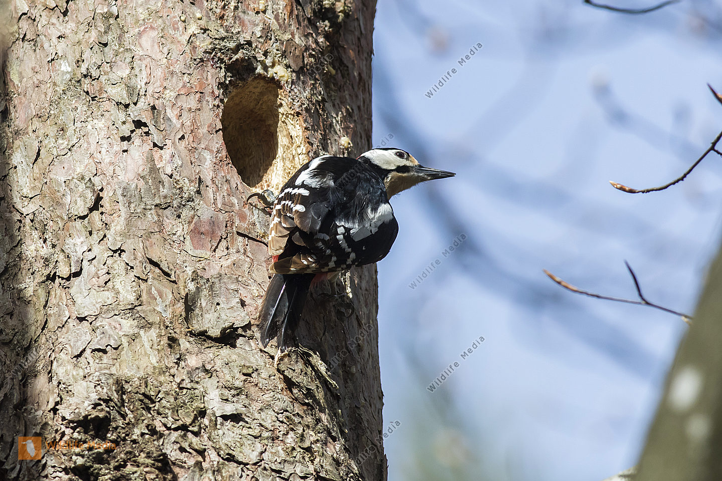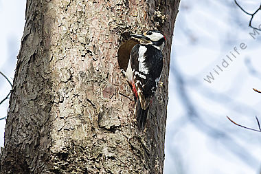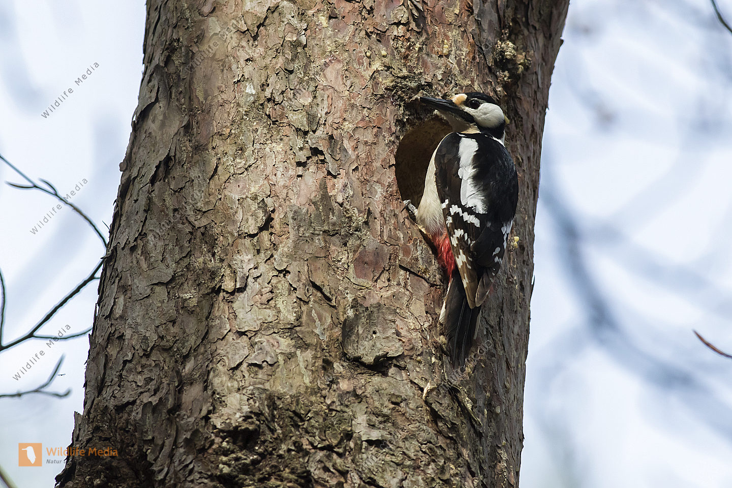 Ein Kleinspecht auf Futtersuche am Baumstamm