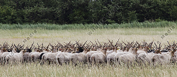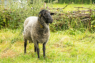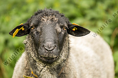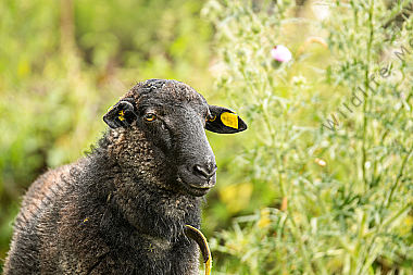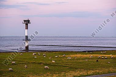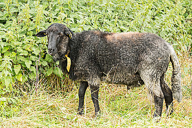 Texelschaf Ovis aries auf dem Deich/Fehmarn