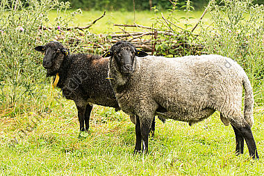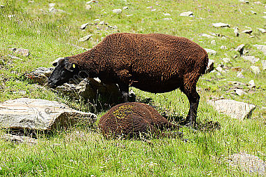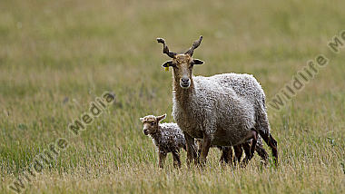Skuddenmutterschaf mit Lämmern Ovis aries auf der Weide