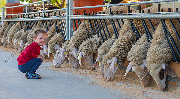 Merinoschafe Ovies aries vor der Weihnachtskrippe